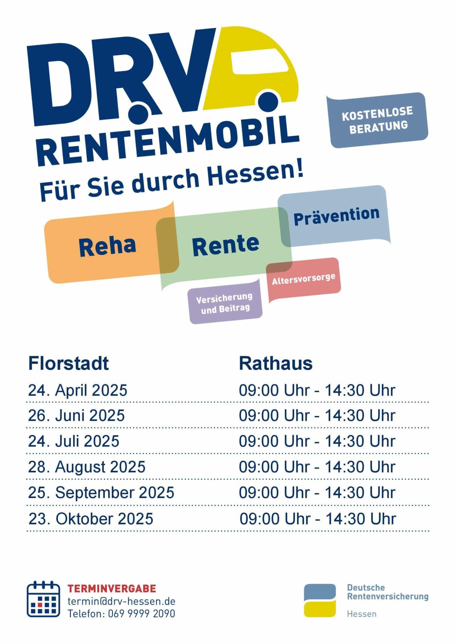 Eine persรถnliche Beratung im Rentenmobil ist nach vorheriger Terminvereinbarung (tel. unter: 069 9999 2090 oder per Mail: ย termin@drv-hessen.de) mรถglich. Die Beratungstermine kรถnnen ab dem 3. Mรคrz gebucht werden.