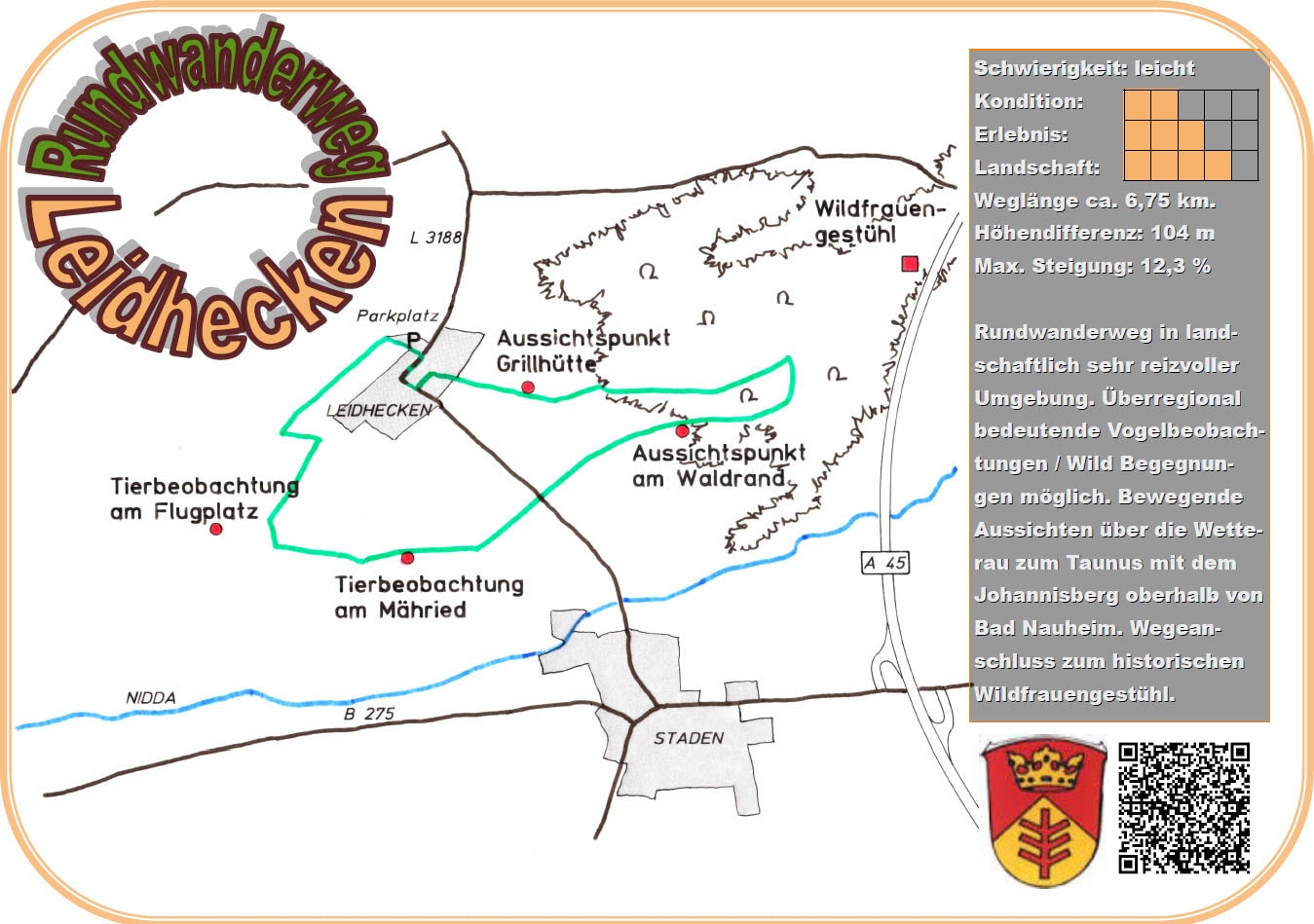 Wir überqueren die Landesstraße, die von Staden über Leidhecken nach Echzell-Bingenheim führt. Vorbei am Friedhof folgen wir dem „Steinweg“ ortsauswärts. Nach gut 200 Metern wenden wir uns an der Grillhütte nach links (1) und laufen auf Asphalt, später auf Teer, in Richtung Wald. Die gewellte Landschaft, die Streuobstbestände und der alte Baumbestand vor und neben uns, erfreuen das Auge.