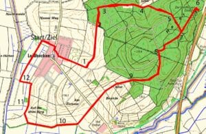 Auf unserer weiteren Wanderung stoßen wir linker Hand auf ein Feld, das wie ein Keil in den Wald getrieben ist. Das Flurstück trägt den Namen Hospitalacker (4). Nach wenigen Metern knicken wir nach rechts ab und wandern weiter leicht bergan (5).