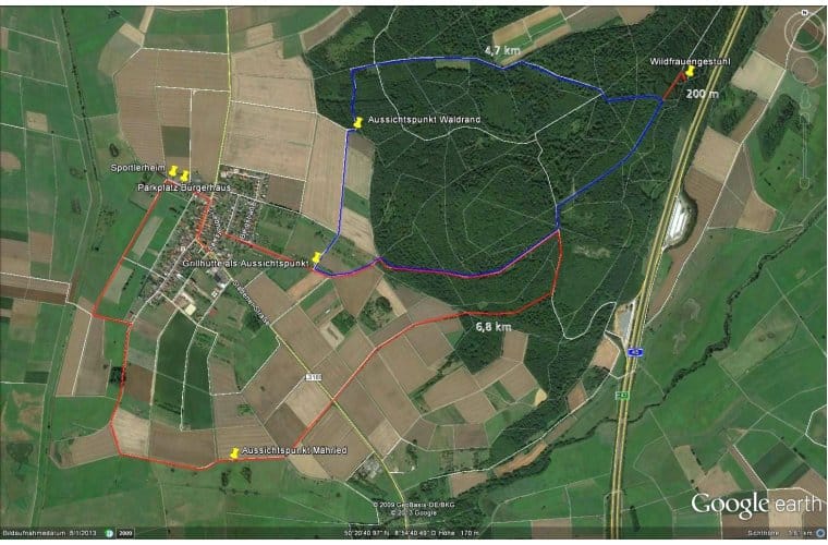 An der nächsten Kreuzung gehen wir geradeaus. Nach knapp 300 Metern sehen wir an einem Baum einen Wegweiser zum Wildfrauengestühl (6). 400 Meter gehen wir jetzt parallel zur Autobahn, die Geräusche der vorbeifahrenden Fahrzeuge werden immer lauter.